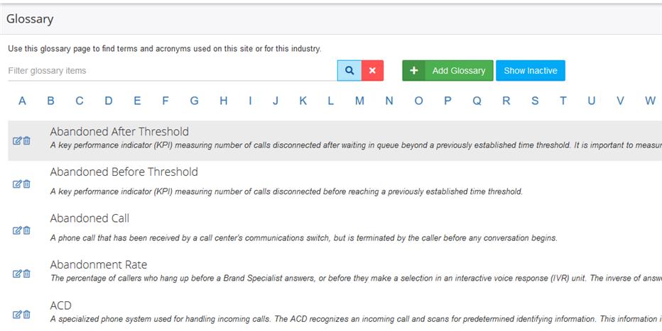 - From the Glossary page you can see all of the items listed alphabetically, and you can also search, filter, and add your own glossary terms.